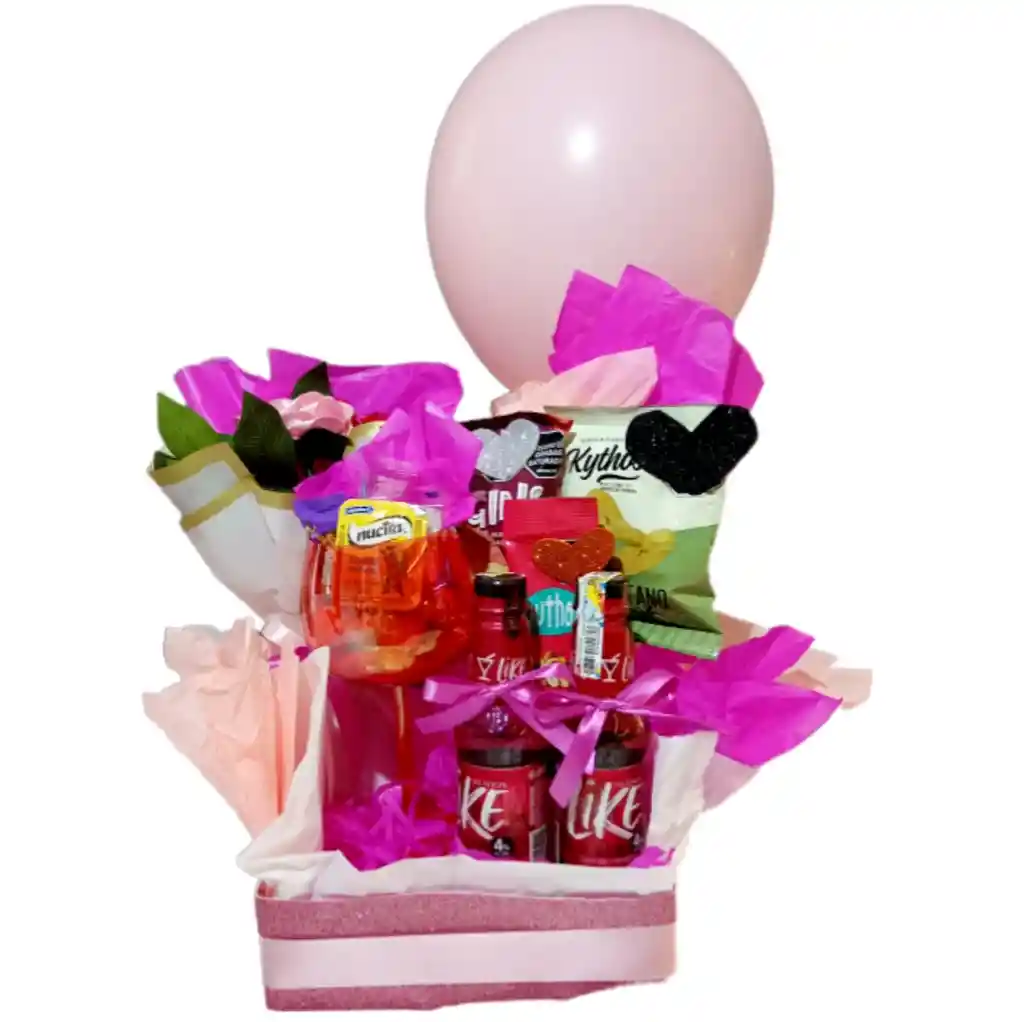 ¡Celebra con estilo y alegría! Este encantador regalo rosa viene acompañado de , perfecto parbebida de moda , copa a juego , flores eternas y comestibles divertidos para sorprender a tus seres queridos en cualquier ocasión especial. Haz que cada momento sea inolvidable con este regalo único y lleno de amor.