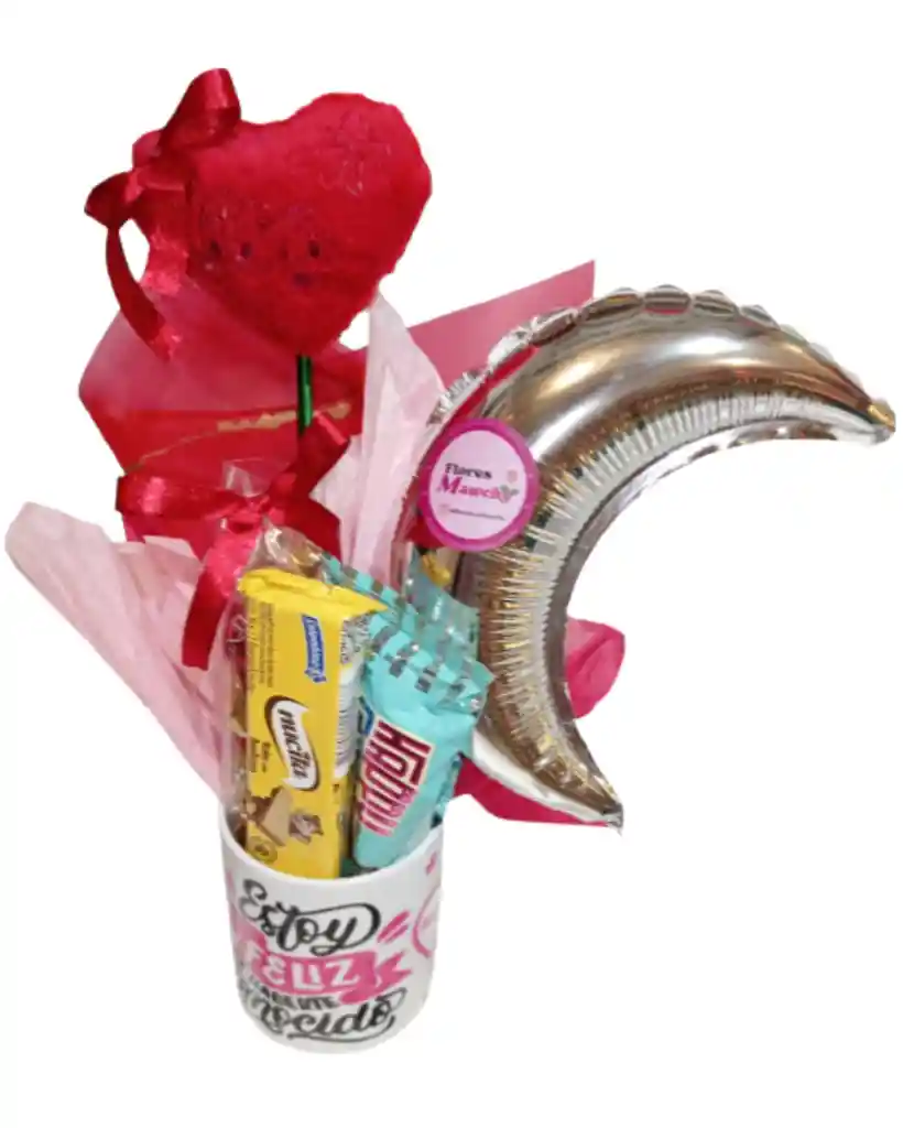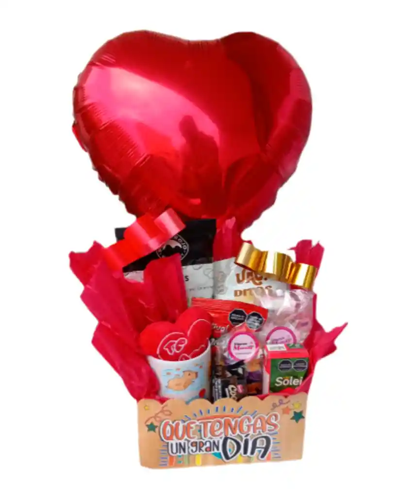 hermosa ancheta con un taza de bebidas , mas otros comestibles deliciosos para deseas un feliz dia , incluye tu mensaje personal , y globo