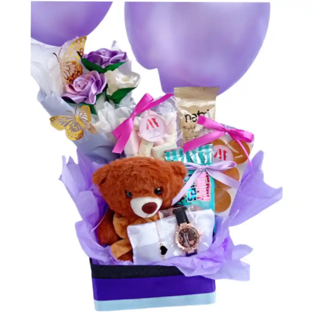 Este regalo encantador incluye un hermoso ramo de rosas eternas, chocolates exquisitos y un adorable oso de peluche que seguramente derretirá corazones. Además, no puede faltar el accesorio reloj de manecillas, que añade un toque de elegancia. Cada elemento ha sido seleccionado cuidadosamente para crear una experiencia mágica y llena de amor. ¡Sorprende a esa persona especial con esta ancheta que habla desde el corazón!