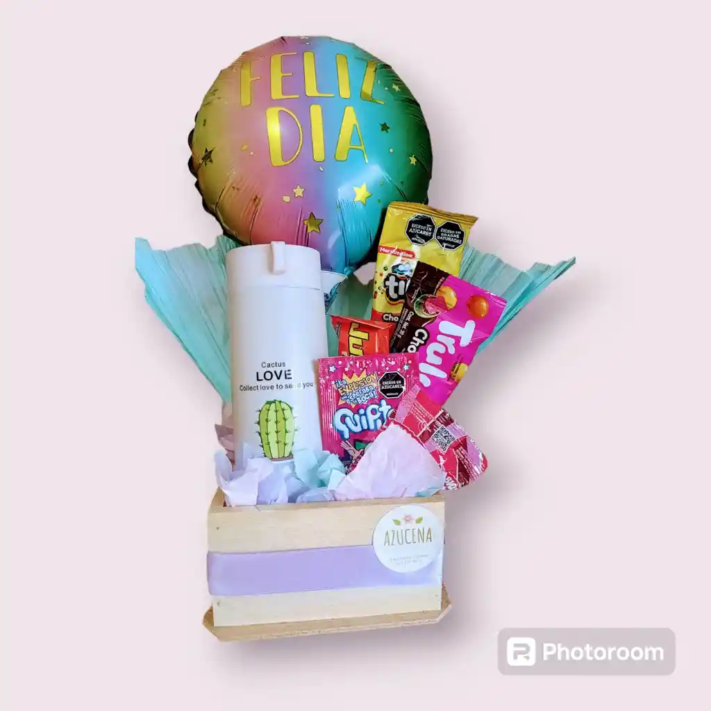 Hermosa ancheta especial para cualquier ocasión, contiene : hermoso termo, trululu chocolores, chocolatina mini jumbo, quipitos, chocmelos caita feliz, paleta de besito, globo metalizado y caja de madera decorada según la ocasión. Día de la secretaria Día del niño Día de la madre Cumpleaños Ideal para cumpleaños, amor y amistad, aniversario, bienvenida, despedidas, grado, novios