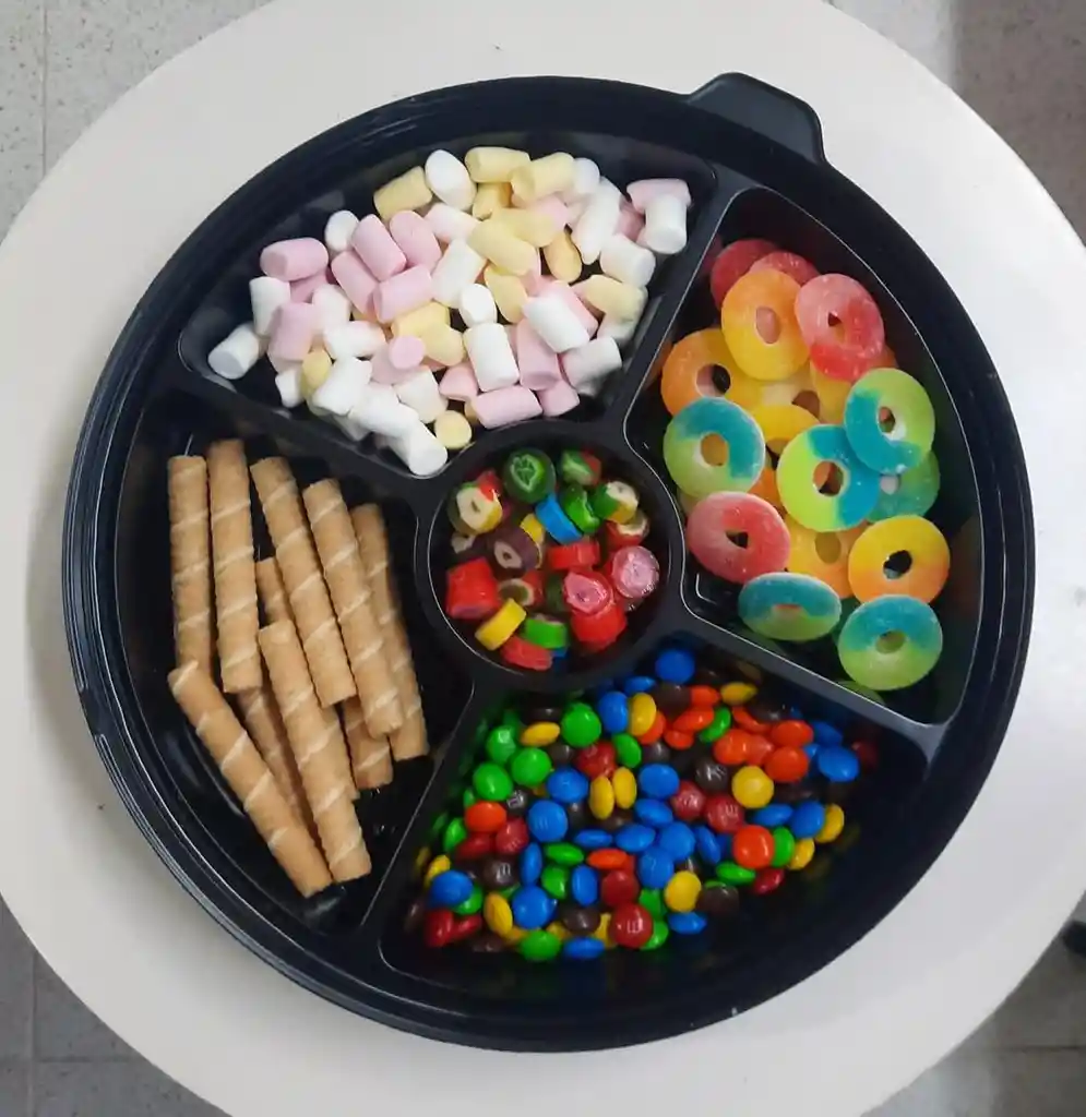 contiene: caja plástica redonda con divisiónes y tapa transparente decorada con moño, en el interior barquillos,masmelos, gomitas, bolitas de chocolate, dulces bananas
