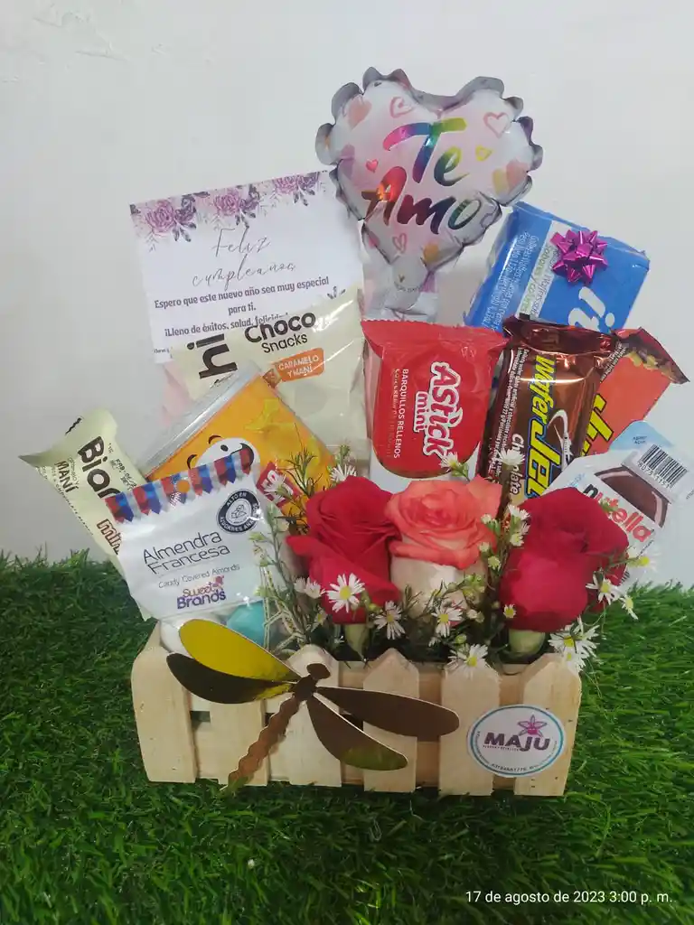 Ancheta dulceera con papas pringles, almendras, barquillos, waferjet, jumbo, galletas italo, choco snacks, nutella, arreglo de tres rosas