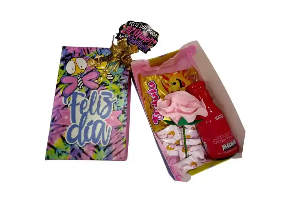 Caja de cartón de 24 cm x 15 cm x 8 cm, con topper de Feliz Día Mujer, incluye una rosa en foami, Té Hatsu, Gomas Trululú, Caramelo con relleno de chocolate rosado, tarjeta personalizada en papel fotográfico, enviar foto y mensaje al correo papelerianova163@gmail.com.