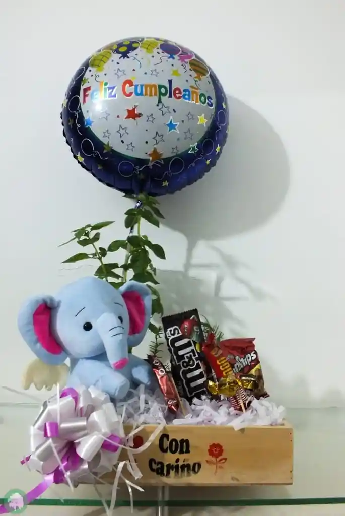 Ancheta con peluche de elefante, m&m, minichips, chocoball, globo y planta