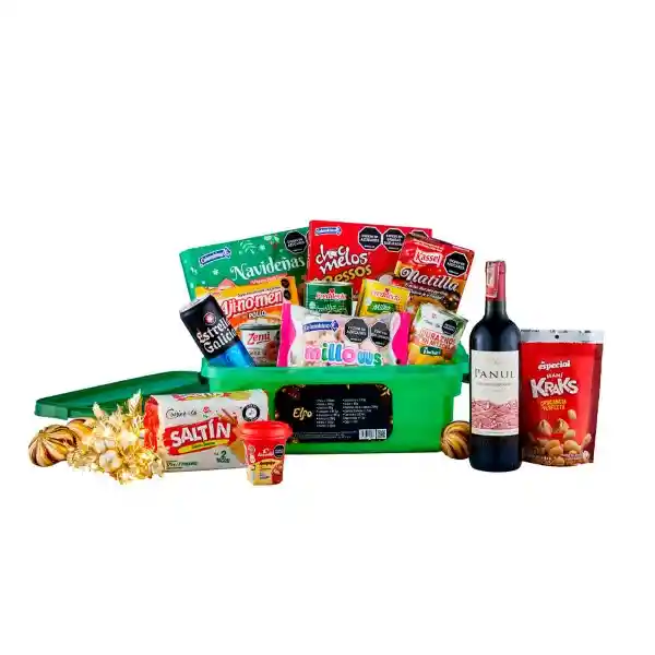 Contiene 20 Unidades. La Ancheta Especial ha Sido Cuidadosamente Seleccionada Para Ofrecer Una Variedad de Productos Deliciosos y de Alta Calidad Ideales Para Compartir en Cualquier Ocasión Especial. Vino Panul Gran Reserva Cabernet Sauvignon 750 mL + Maní la Especial Kraks Doy Pack 140 g + Cerveza Estrella Galicia 0.0% Lata 330 mL + Masmelos Millows 75 g + Masmelos Chocmelos Bessos Caja 6 Und x 90 g + Sopa Instantánea Fideo Ajinomen Pollo 80 g + Salchicha Viena Limón Zenu Edición Especial 150 g + Arveja Predilecta 280 g + Maíz Predilecta 280 g + Arequipe Alquerida Tradicional Vaso 150 g + Natilla Kassel Arequipe 300 g + Duraznos Cuisine & Co Mitades Almíbar 410 g + Galletas Cuisine & Co Saltin Salada 175 g + Galletas Navideñas Surtidas 200 g + Caja Monserrat no. 2 Baja 12 L - Elfo 2024 1.