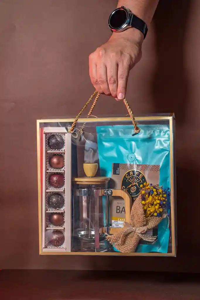 Elegante Bolso Traslucido que incluye: 1 Caja bombones X6 1 Café de origen Cerro de Oro 250gr 1 Prensa francesa personal 1 sutil arreglo floral.
