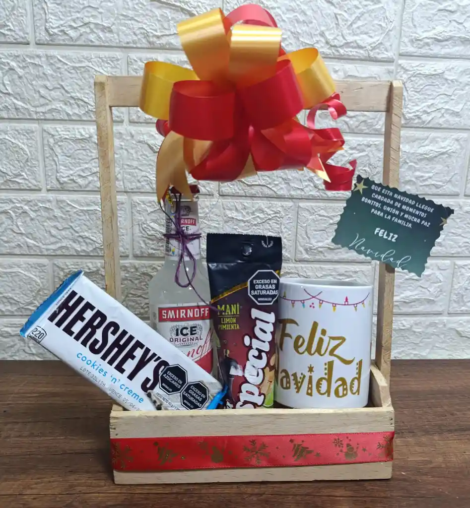 Detalle con: 1 taza o mug navideño 1 chocolatina americana 1 Smirnoff 1 mix de frutos secos. Regalo de navidad.