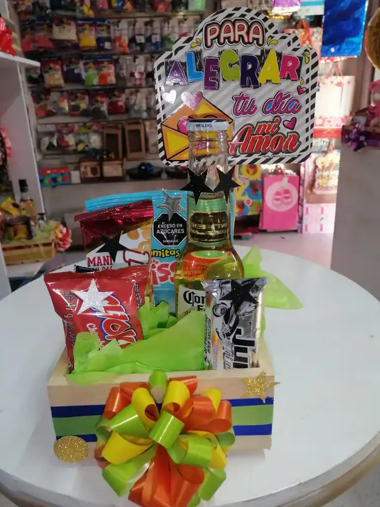 contiene:, caja madera pino decorada, dulces, corona yglobo