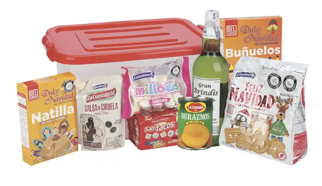 Contiene 9 Unidades Natilla Dulce Navidad 1 Und + La Constancia salsa de Ciruela 1 Und + Colombina Masmelos Sortidos 1 Und + La Coruña Duraznos en Mitades 1 Und + Maestria Galletera Saltitacos 1 Und + Gran Brindis 1 Und + Colombina Galletas Surtidas 1 Und + Dulce Navidad Buñuelos 1 Und + Caja 1 Und.