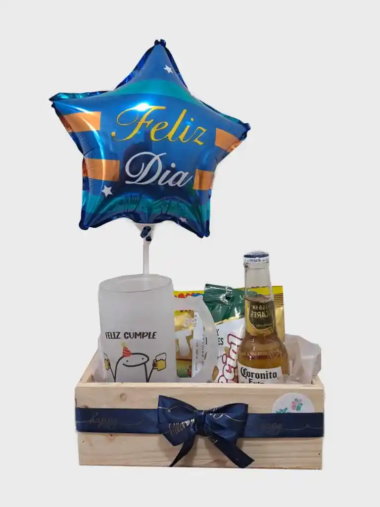 Ancheta pequeña - Feliz cumple Contiene: 1 Jarra de cerveza con diseño "Feliz cumple", 1 Coronita, 1 Hershey, 1 gomitas, 1 paquete de mani y globo pequeño "Feliz día" *Los productos pueden variar según disponibilidad