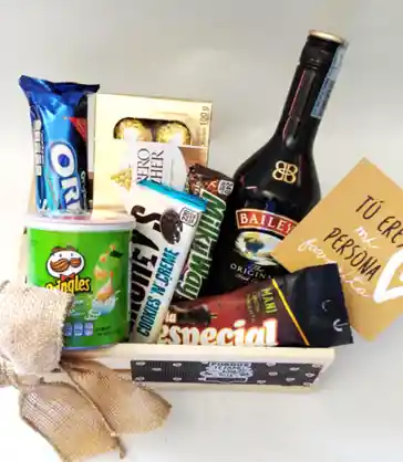 Ancheta feliz día. Contenido: Botella de Baileys, Canasta de madera, FerreroX8, Hershey’s, Maní, Milkyway, Moño, Oreo Grande, Pringles Pequeña, Tarjeta Personalizada