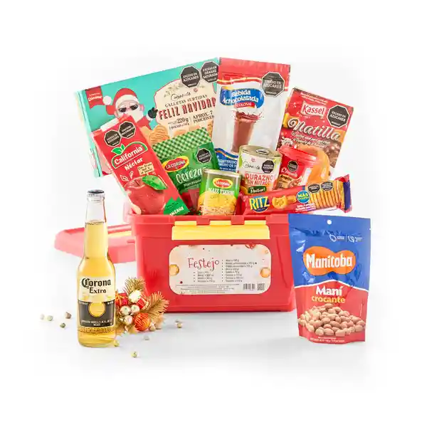 Contiene 11 Unidades. California Nectar Manzana Tb 900 mL + Natilla Kassel Arequipe 300 g x 20 + Alquerida Arequipe Tradicional Vaso 150 g + Mani Japonés 150 g + Colosal Bebida Achocolatada 200 g + Cuisine & Co Galleta Navidad Surtidas 220 g + Maiz Tierno 248 g + Ritz Taco Co 70 g + Marraschino Cereza Bolsa 125 g + Corona Cerveza Contiene 6 Unidades de 330 mL c/u + Cuisine & Co Durazno Mitade Almibar 1 Und + Caja Salento Nº 2 - 10 L - Festejo 2025.