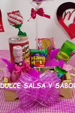 CAJA MADERA. FLOR ROSA ORIGAMI, PRINGLES GRANDES FERREROX 4 CHENET PEQUEÑO, O VINOGATO NEGRO PEQUEÑO, MANI MOTO, BARRA DE CEREAL TACO ITALO ENVUELTO PAPEL SECE MOÑO