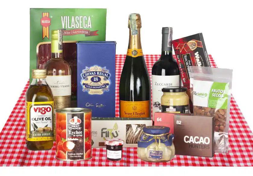 Contiene: Chivas Regal Whisky 18 Years 750 Ml + Veuve Clicquot Champaña Brut 750 Ml + Perlita Vino Blanco Chardonnay 750 Ml + Botter Pinot Grigio Vino Blanco 750 Ml + Henaff Mousse De Pato 115 G + Fiizu Galletas Linaza 125 G + Vigo Aceite Oliva Extra Virgen 500 Ml + Vilaseca Jamón Serrano 100 G + Vie Sané Almendra Tostada 250 G + Ventresca Atún Tunalia Aceite Oliva 110 G + Equiori Chocolate 70 80 G + Clovis Mostaza Dijon 200 G + Jolca Aceituna Verde Jamón Serrano 300 G + Bolab Perlas Fresa Albahaca 30 G. .. .