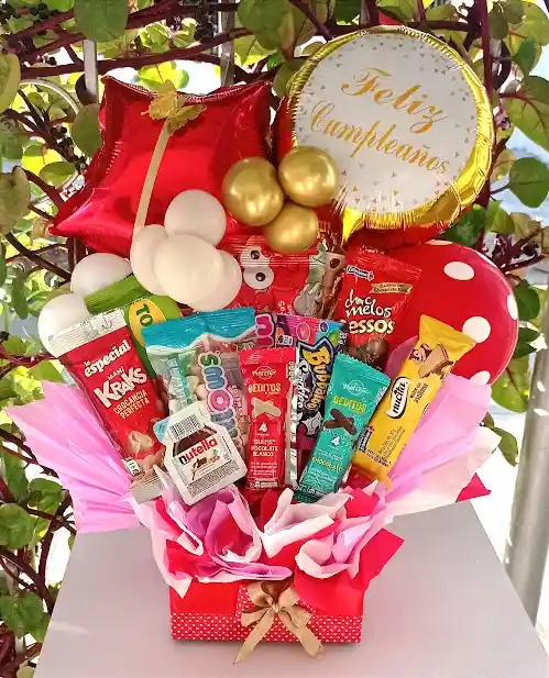 1 CAJA DECORADA 2 GLOBOS METALIZADOS DULCES SURTIDOS TARJETA