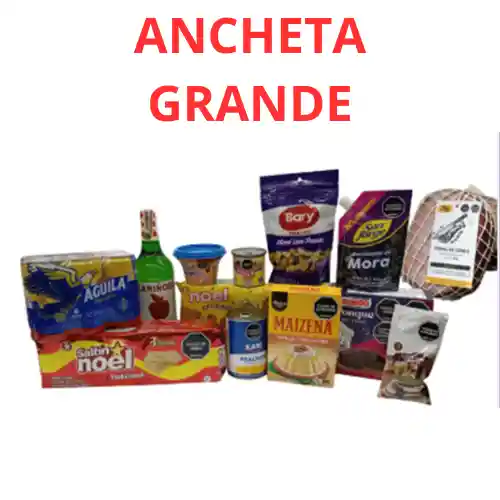 BELLA ANCHETA NAVIDEÑA CONSTA: 1. VINO MANZANA CARIÑOSO - CASA RHIN 750ML 2. GALLETA CARAVANA NOEL X200GR 3. NATILLA (SABOR SURTIDO) MAIZENA X300GR 4. MERMELADA (FRESA-MORA) BARY X200GR 5. DURAZNO EN MITADES KARI 410GR 6. AREQUIPE CASTILAC X220GR 7. SALCHICHA VIENA RICA X150GR 8. GALLETA SALTIN NOEL 3 TACOS X300GR 9. PONQUE VINO BIMBO X260GR 10. MANI DE SAL BARY X180GR 11. CERVEZA AGUILA SIXPACK X269ML 12. CENA NAVIDEÑA VIENA X450GR 13 SALSA CIRUELA TECNA X80GR 14. CANECA GRANDE IN 108 15 CELOFAN NAVIDEÑO (1X1MTS) 16 MOÑO DE REGALO NOTA: EN CASO DE AGOTARSE ALGUN PRODUCTO DE ESTAS MARCAS SE CAMBIARA POR UNO SIMILAR DE OTRA REFERENCIA