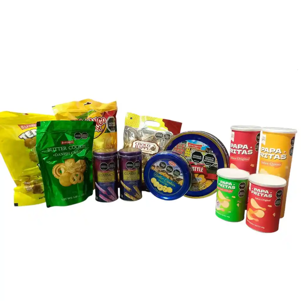 Incluye: 1 bolsa choco happy x 10 chocolates 1 bolsa galletas mantequilla 150gr 1 lata galletas mantequilla grande 280gr 1 lata galletas marino 114gr 2 papas pequeñas 45gr c/u 2 tarros barquillos 114gr c/u 2 papas grandes 120gr c/u 1 bolsa caramelo masticable teddy 600gr 1 bolsa caramelo mango maxx 600gr
