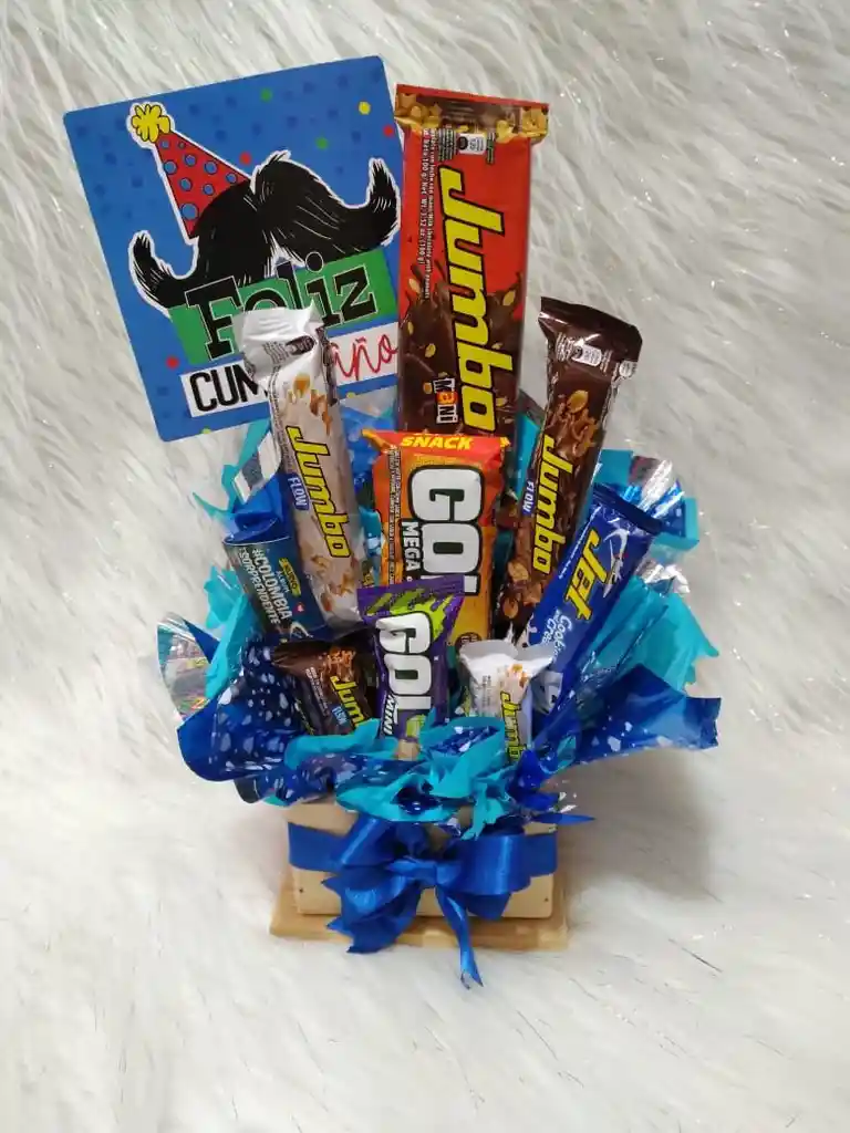 Ancheta pequeña con chocolatinas variadas, pin y decoración de cumpleaños
