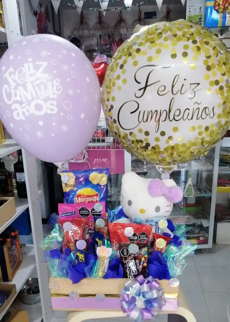 caja madera, dulces,globos,peluche