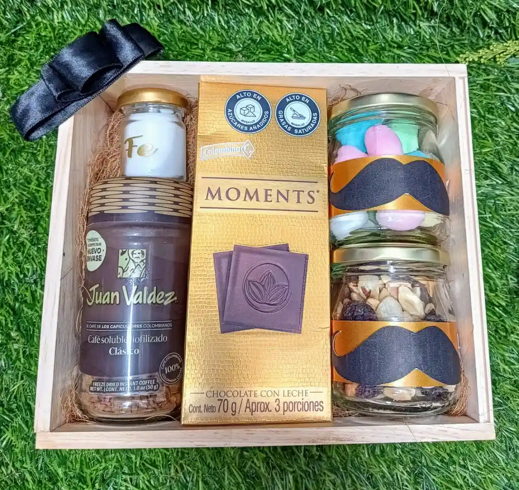 Hermosa ancheta en caja de madera con frasco de frutos secos, frasco de almendras, con vela aromática, café juan Valdez y chocolatina americana