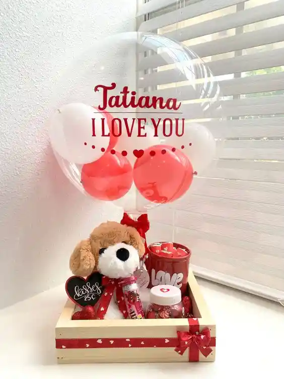Contiene peluche ( puede variar según disponibilidad) tarro pequeño de dulces variados, vaso con masmelos, globo de i love you, decoración y mensaje personalizado