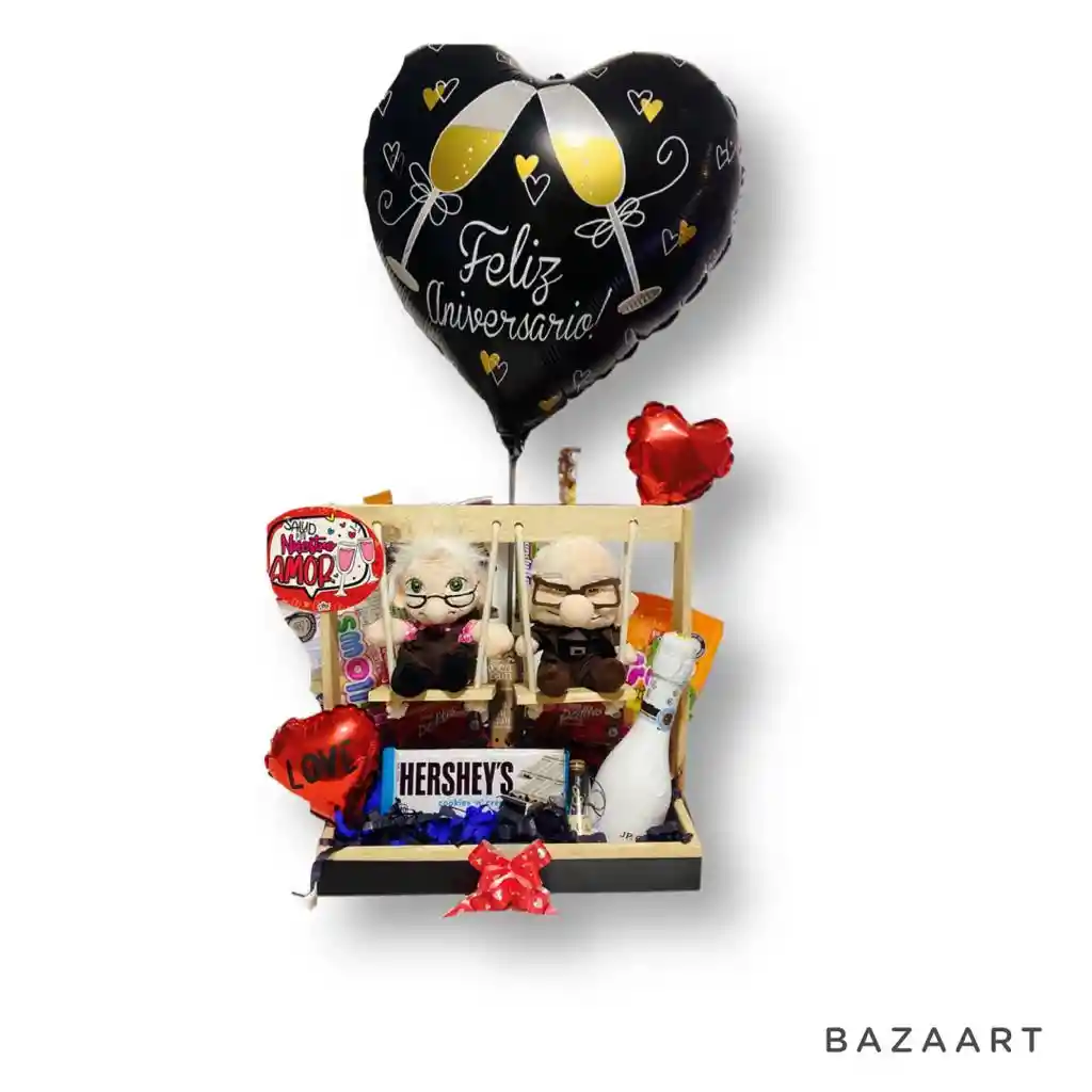 En esta ancheta encontrarás: (1) Globo corazón motivo aniversario 18" (2) globos corazón pequeños (2) peluches (pareja up) 14 cm (1) chocolate Hersheys (1) tarjeta mensaje (1) paquete de gomitas, (1) paquete de masmelos, (2) piazza jirafa, (1) mani individual, (1) granola individual, 2 dulces candu ranch, (2) deditos nestle (1) botella de JP 200 ml blanco o rosado, para brindar por el aniversario y hacer de este momento una celebración aún más especial. (1) minibotella decorativa (1) base ancheta con columpio madera con cinta y moño Picadillo de papel