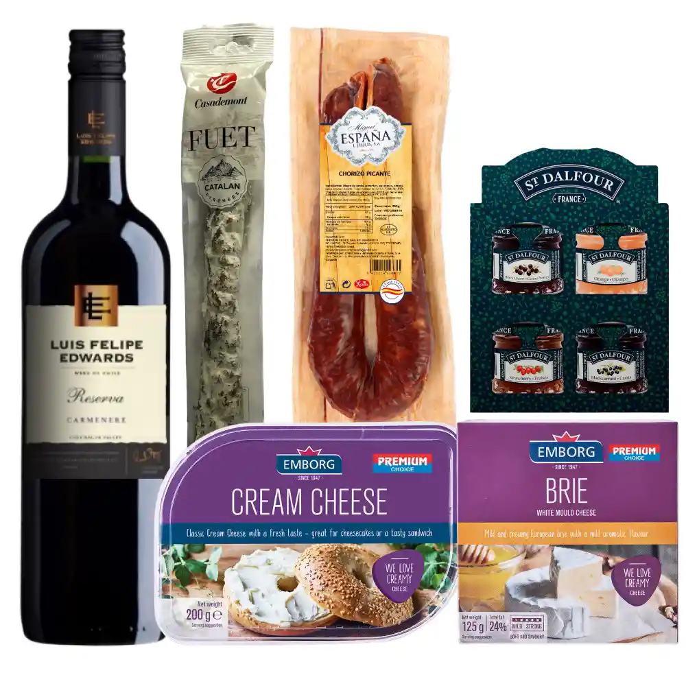 Vino Luis Felipe Edwards Carmenere Fuet Extra x 160g Chorizo Sarta Queso Brie Emborg Cream Cheese Emborg Mermelada Mini St Dalfour x 4 unds
