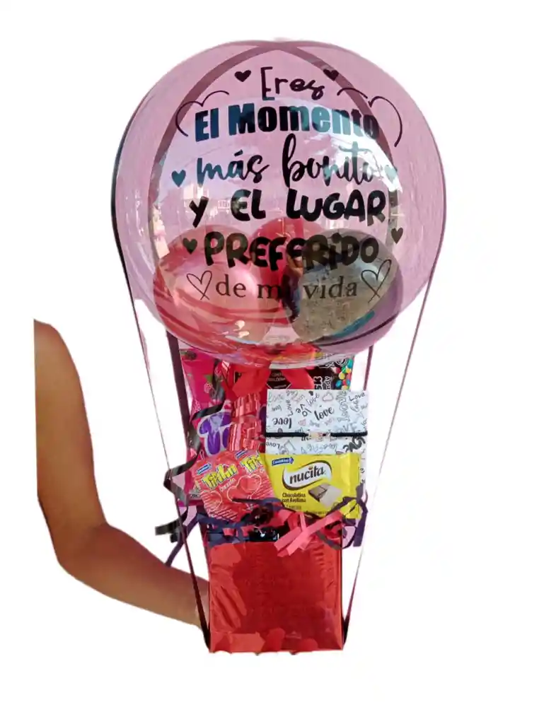 Ancheta Perfecta para enamorar: Caja cuadrada forrada Globo burbuja personalizado 10 pulgadas mensaje: "Eres el momento más bonito y el lugar preferido de mi vida" ... Paquete de gomas Chocodisk Chocolatina nucita Tipitin Manilla infinito ... Decoración general Tamaño 50cm alto x 25ancho aprox.