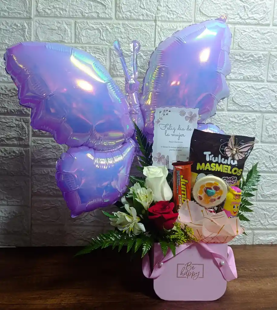 Elegante arreglo de regalo para el Día de la Mujer, con un globo metálico de mariposa iridiscente, flores frescas (rosas y alstroemerias), surtido de dulces premium y tarjeta, todo en una encantadora caja. chocolate Jumbo, masmelos Trululu, paleta de chocolate