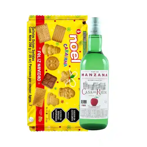 MATRIMONIO VINO MANZANA CASA DEL RHIN 750ML + GALLETA CARAVANA NOEL 200GR EMPACADO EN PAPEL CELOFAN