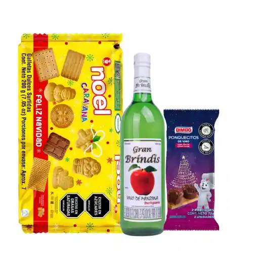 MATRIMONIO VINO MANZANA GRAN BRINDIS 750ML + GALLETA CARAVANA NOEL 200GR + PONQUE VINO X72GR EMPACADO EN PAPEL CELOFAN