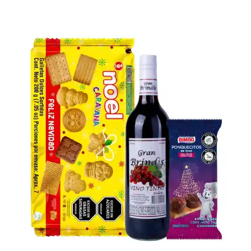 MATRIMONIO VINO TINTO GRAN BRINDIS 750ML + GALLETA CARAVANA NOEL 200GR + PONQUE VINO X72GR EMPACADO EN PAPEL CELOFAN