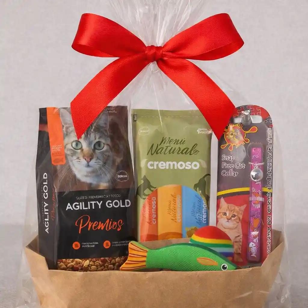 Incluye super premium cat food, Menú Natural Cremoso, juguete pez, collar Cat Club y juguete bolita, combinando nutrición, diversión y cuidado en un solo detalle. Ideal para regalar y hacer feliz a tu gato con productos de calidad y entretenimiento