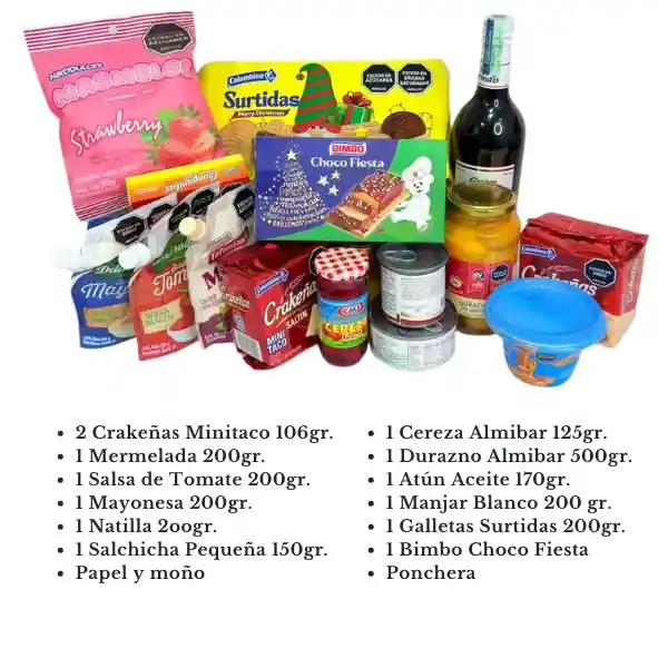 3 Crakeñas Minitaco 106gr. 1 Mermelada 200gr. 1 Salsa de Tomate 200gr. 1 Mayonesa 200gr. 1 Natilla 2oogr. 1 Salchicha Pequeña 150gr. 1 Cereza Almibar 125gr. 1 Durazno Almibar 500gr. 1 Atún Aceite 170gr. 1 Manjar Blanco 200 gr. 1 Galletas Surtidas 200gr. 1 Bimbo Choco Fiesta1 Masmelo 80gr. 1 Vino Gran Brindis 6° 750ml.