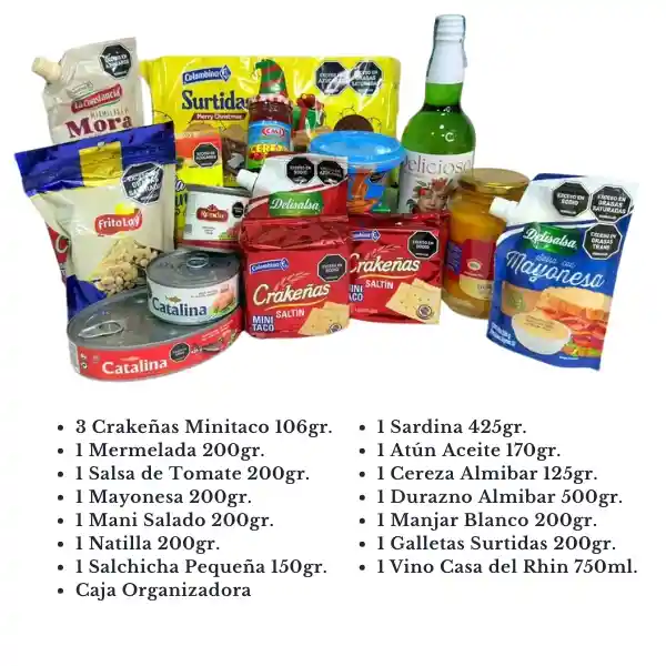3 Crakeñas Minitaco 106gr. 1 Mermelada 200gr. 1 Salsa de Tomate 200gr. 1 Mayonesa 200gr. 1 Mani Salado 200gr. 1 Natilla 200gr. 1 Salchicha Pequeña 150gr. 1 Sardina 425gr. 1 Atún Aceite 170gr. 1 Cereza Almibar 125gr. 1 Durazno Almibar 500gr. 1 Manjar Blanco 200gr.1 Galletas Surtidas 200gr. 1 Vino Casa del Rhin 750ml.