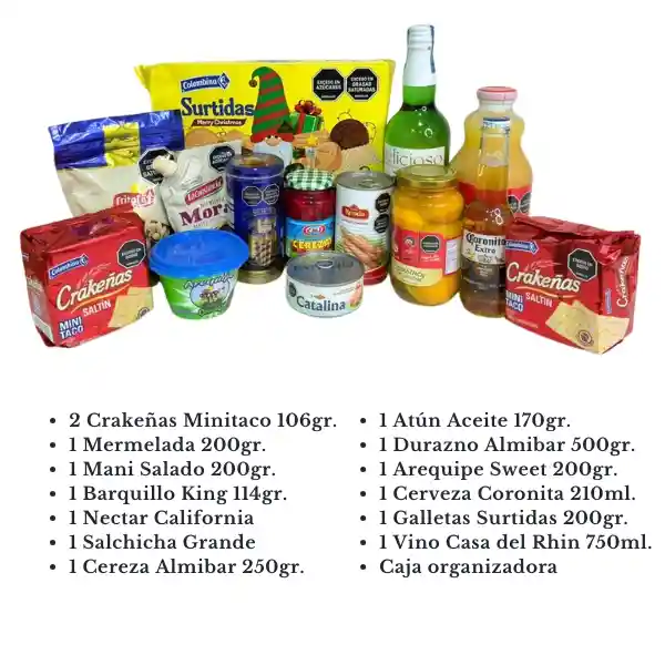2 Crakeñas Minitaco 106gr. 1 Mermelada 200gr. 1 Mani Salado 200gr. 1 Barquillo King 114gr. 1 Nectar California 1 Salchicha Grande 1 Cereza Almibar 250gr. 1 Atún Aceite 170gr. 1 Durazno Almibar 500gr. 1 Arequipe Sweet 200gr. 1 Cerveza Coronita 210ml.1 Galletas Surtidas 200gr. 1 Vino Casa del Rhin 750ml.