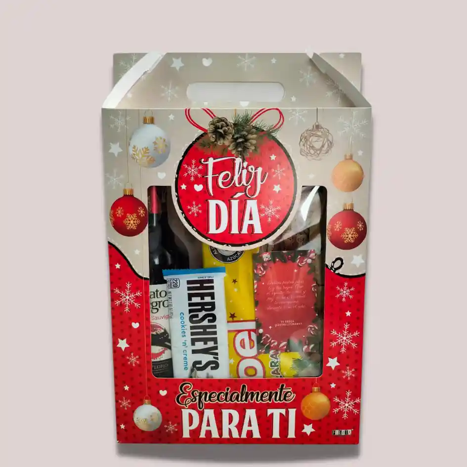 Caja navideña acompañada de vino gato negro cabernet de 750 Ml, galletas caravana caja, maní especial con uvas pasas ,chocolatina Hershey´s blanca y tarjeta