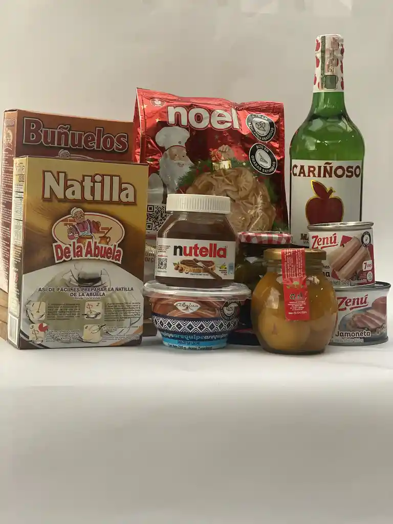 Esta ancheta contiene 1 Botella de vino cariñoso de manzana 1 Caja de galletas Caravana 200 gr (galletas dulces surtidas) 1 Caja de Natilla de la abuela 300 gr (mezcla lista para preparar natilla) 1 Caja de Buñuelos de la abuela 300 gr /Mezcla lista para preparar buñuelos) 1 Arequipe Alpina 220 gr 1 Frasco de duraznos en almíbar 275 gr 1 Frasco de brevas en almibar 280 gr 1 Nutella 140 gr 1 Lata de salchichas viena Zenú 150 gr 1 Jamoneta Zenú 180 gr Caja Kendy 14Ltr Envoltorio de Ancheta (Moño, papel celofán y tarjeta)