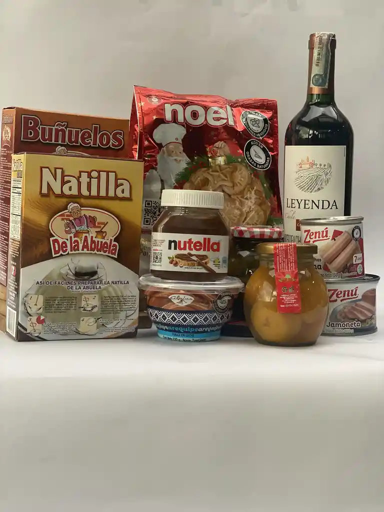 Esta ancheta contiene 1 Botella de vino leyenda Merlot 1 Bolsa de galletas Noel 220 gr (galletas dulces con sabor a vainilla) 1 Caja de Natilla de la abuela 300 gr (mezcla lista para preparar natilla) 1 Caja de Buñuelos de la abuela 300 gr /Mezcla lista para preparar buñuelos) 1 Arequipe Alpina 220 gr 1 Frasco de duraznos en almíbar 275 gr 1 Frasco de brevas en almibar 280 gr 1 Nutella 140 gr 1 Lata de salchichas viena Zenú 150 gr 1 Jamoneta Zenú 180 gr Caja Kendy 14Ltr Envoltorio de Ancheta (Moño, papel celofán y tarjeta)
