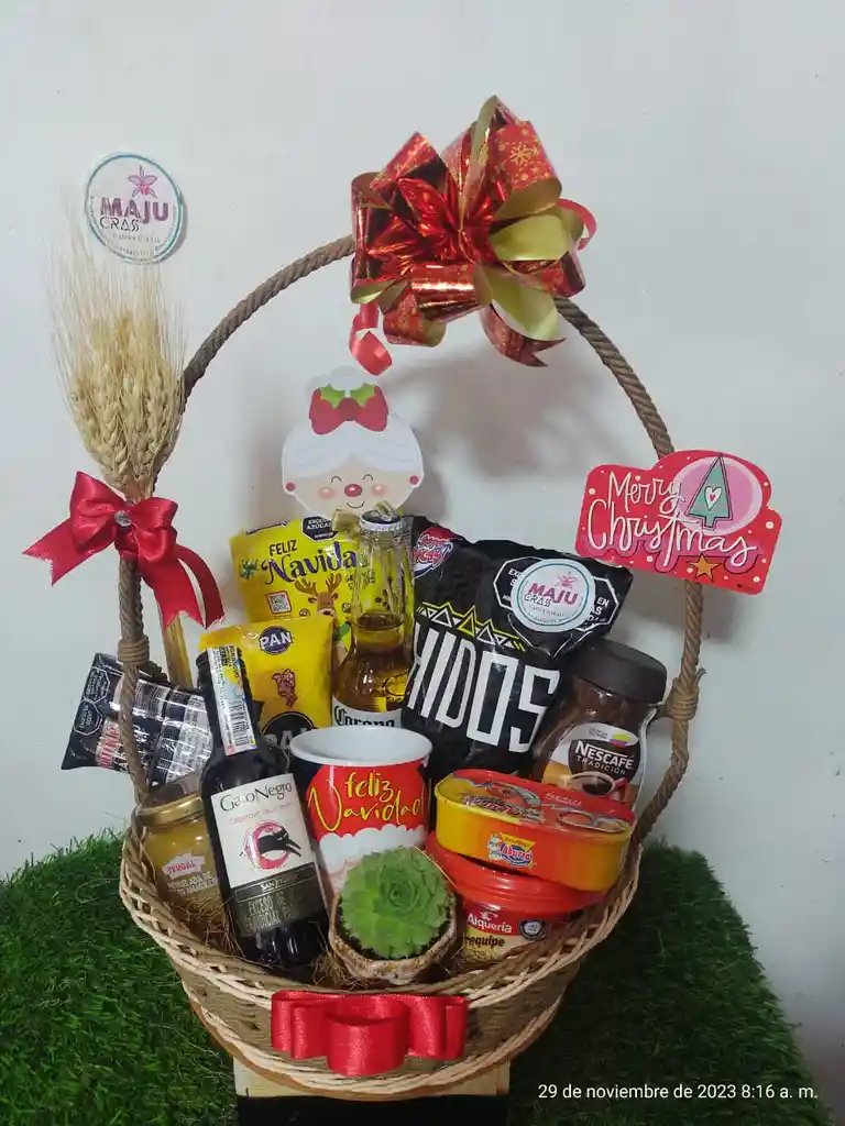 Ancheta navideña en mimbre con deliciosos productos para compartir. Incluye: 1 Cerveza corona 1 Pocillo navideño 1 paquete de galletas de navidad de mantequilla 1 paquete de maiz para arepas 1 Mermelada en frasco de vidrio 1 paquete de cabano 1 frasco de café tradicional 1 dulce de arequipe 1 Enlatado de sardina 1 vino marca gatonegro 1 planta suculenta 1 Paquetón de snack