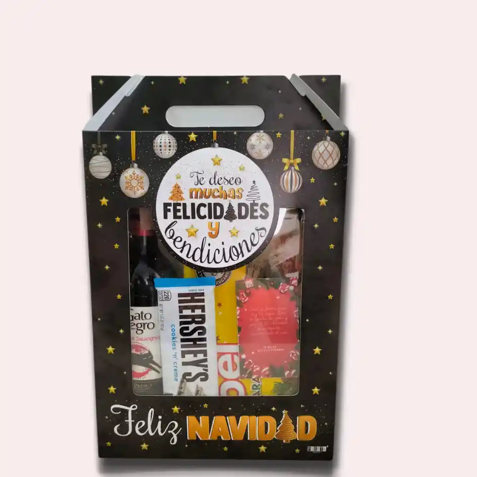 Caja navideña felicidades, acompañada de vino gato negro cabernet de 750 Ml, galletas caravana caja, maní especial con uvas pasas, chocolatina Hershey´s y tarjeta