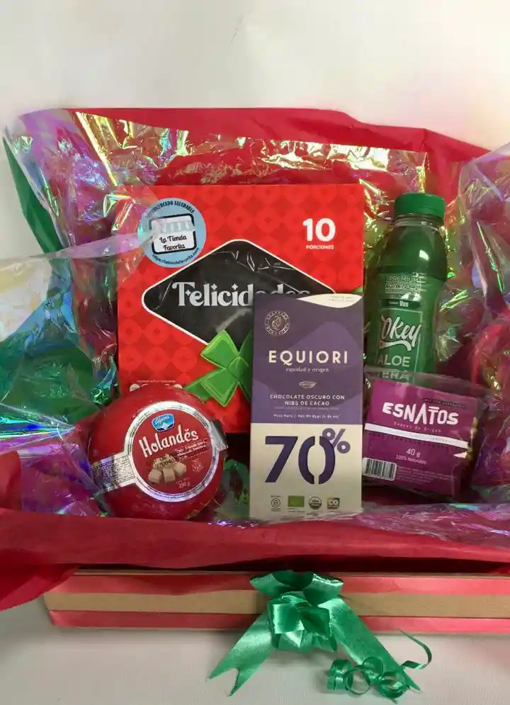 Ancheta Navideña #3 Contiene: 1. Caja de Madera Decorada. 2. Ponqué Navideño x 600g. 3. Jugo Saludable x 300ml. 4. Queso Holandés. 5. Barra de Chocolate Orgánico al 70%. 80gr. 6. Frutos Secos x 40g.