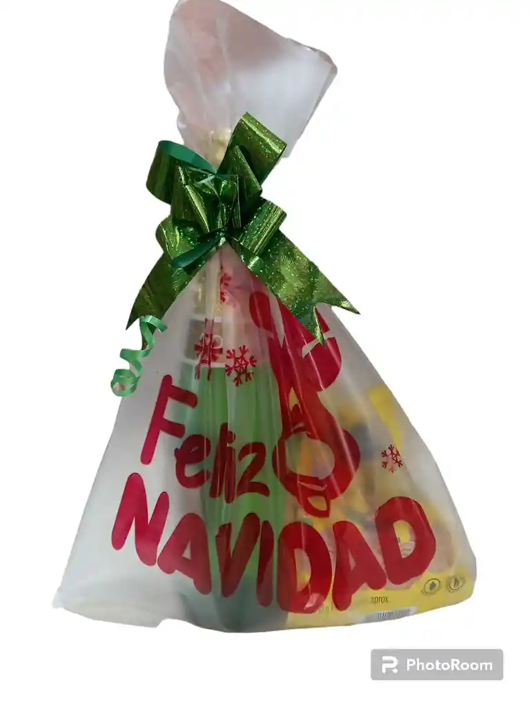 Lindo detalle navideño, sencillo y cenómico consta de 2 productos: bebida gasificada sabor a vino SIN LICOR, botella tipo champaña, acompañado de galleta colombina navideña de 150 g, en una bolsa decorada navideña.