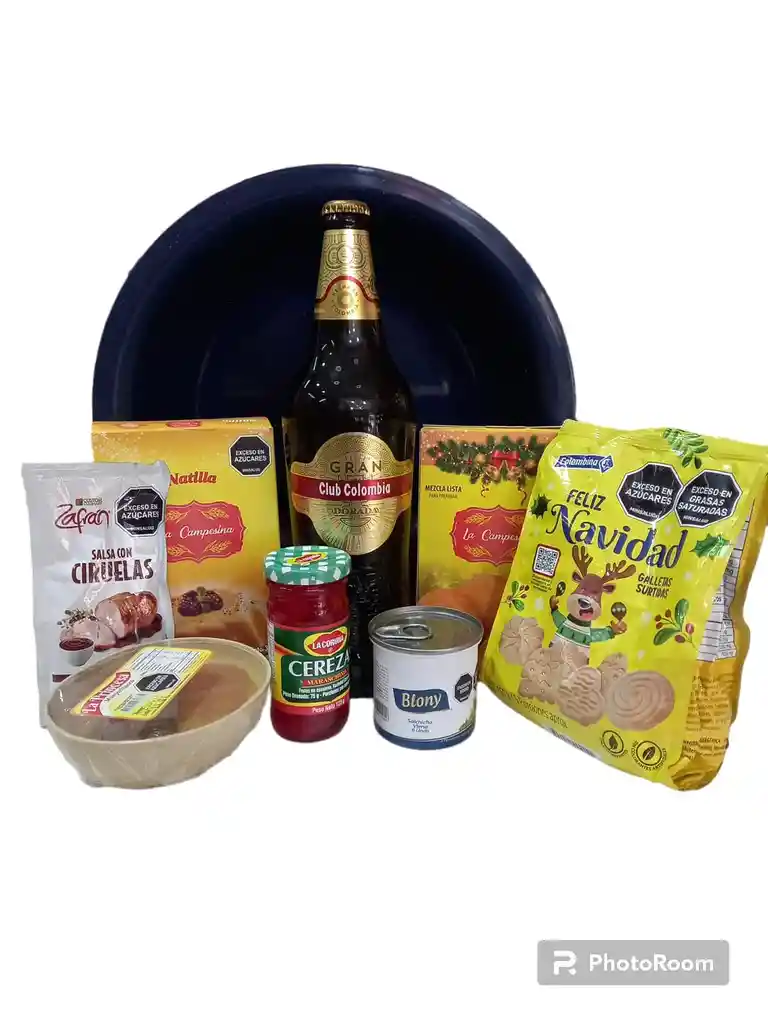 ancheta navideña 9 productos: galleta colombina en bolsa 150g, mezcla natilla arequipe 300g, mezcla buñuelos 300g, sobre de salsa con ciruelas 100g, cerezas la coruña 125g, manjarblanco 250g, salchicha Viena x 6 unds, club Colombia gigante de 850ml y platón plástico multiusos.