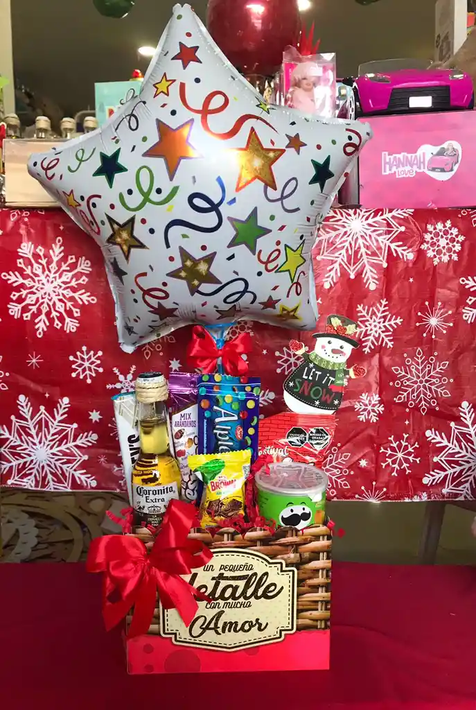 Ancheta Navideña, contiene productos variados como papa pringle, mani, galletas, chocolate, hatsu o cerveza.