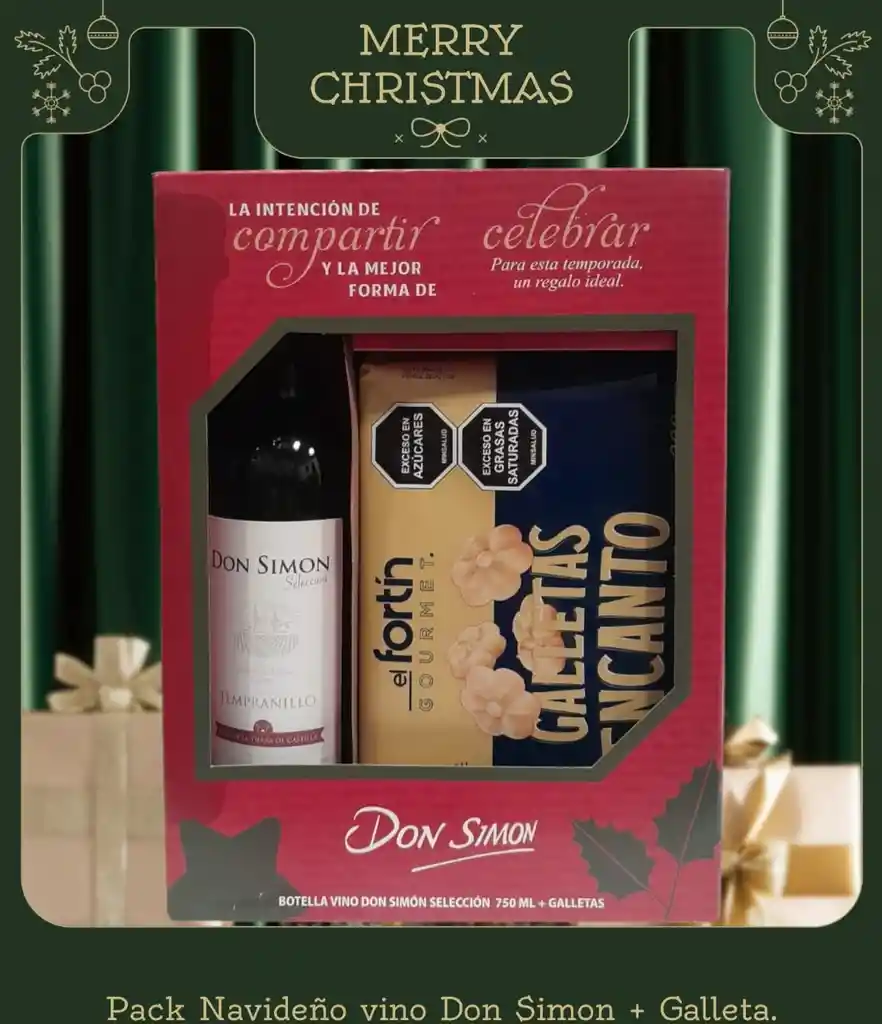 hermosa ancheta navideña con vino tinto don Simón 750 ml con galletas fortin, lazo navideño y tarjeta dedicatoria para regalo elegante .