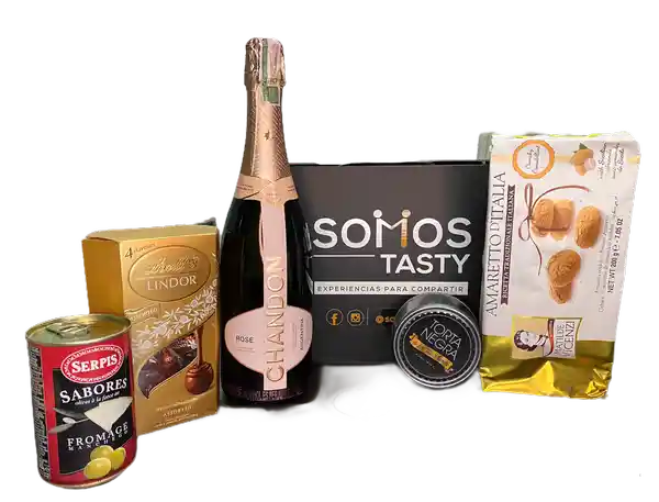 Este tasty regalo navideño incluye: Chandon Rose 750 mL aceitunas Serpis 300 g torta negra Tia Blanca galletas de Amaretto 200 g chocolate lind Lindor 200 g.