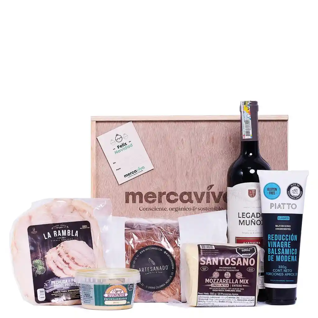 Ancheta navideña Christmas Night. Un detalle para crear un ambiente único! Regala una experiencia única y saludable. ¡Compartir, sorprender, sentir y disfrutar un regalo especial en Navidad! Productos Ancheta navideña Christmas Night: Pechuga De Pavo Ahumada x 230 gr Queso Mozzarella De Búfala En Bloque Santo Sano x 500 Gr Pan Integral De Semillas x 500 gr Hummus Con Pesto Gypsy x 200 Gr Vino Tinto Legado Muñoz Garnacha Reducción De Vinagre Balsámico Clásico Tarjetas, cinta y decoración Caja de Madera