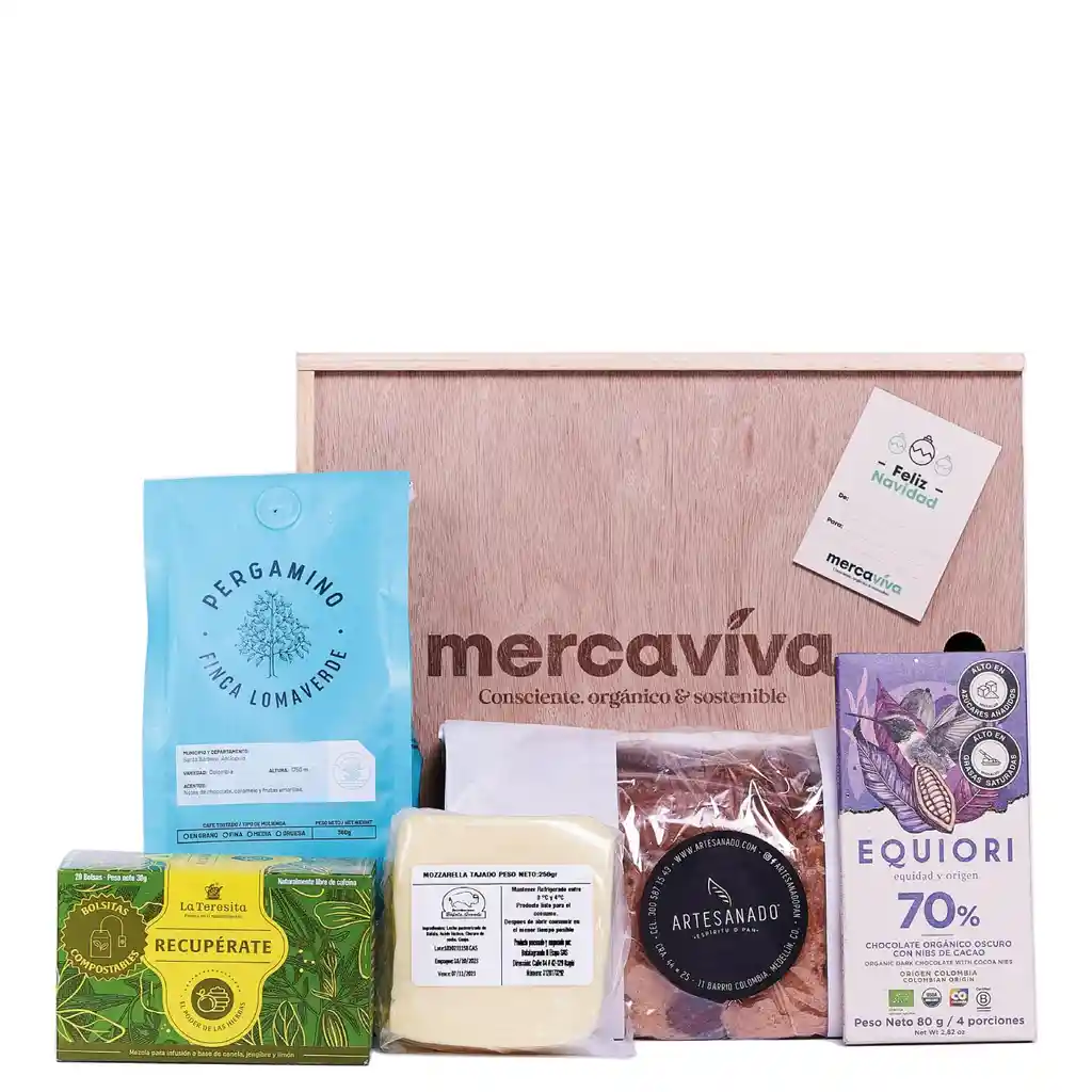 Ancheta Navideña Family First. Un detalle ideal para pasar en familia, para un brunch y llevar una experiencia única y saludable. ¡Compartir, sorprender, sentir y disfrutar!. Un regalo especial para navidad!. Productos Ancheta Family First: Pan De Queso Artesanal x 500 gr Infusion Jengibre Miel La Teresita x 20 unids Queso Mozzarella De Bufala Entero X 250 Gr Café Finca Lomaverde Pergamino X 360 Gr Barra de Cacao Orgánico Al 70% Con Nibs Equiori x 80 gr Caja de Madera