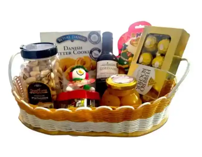 Super ancheta premium para endulzar en fechas especiales: Sorprende y endulza a mamá con esta linda y deliciosa sorpresa que seguramente le encantará! El Kit incluye: - 1 Estuche Navidad x 35 grs - 1 Masmelos bota navidad x 50 grs - 1 galletas danish caja x 125 grs - 1 Duraznos en almibar x 260 grs - 1 Vino santa carolina cabernet sauvignos x 187 ml - 1 caja de chocolates ferrero x 8 unidades - 1 tarro de pistachos x 220 grs - 1 canasta organizadora